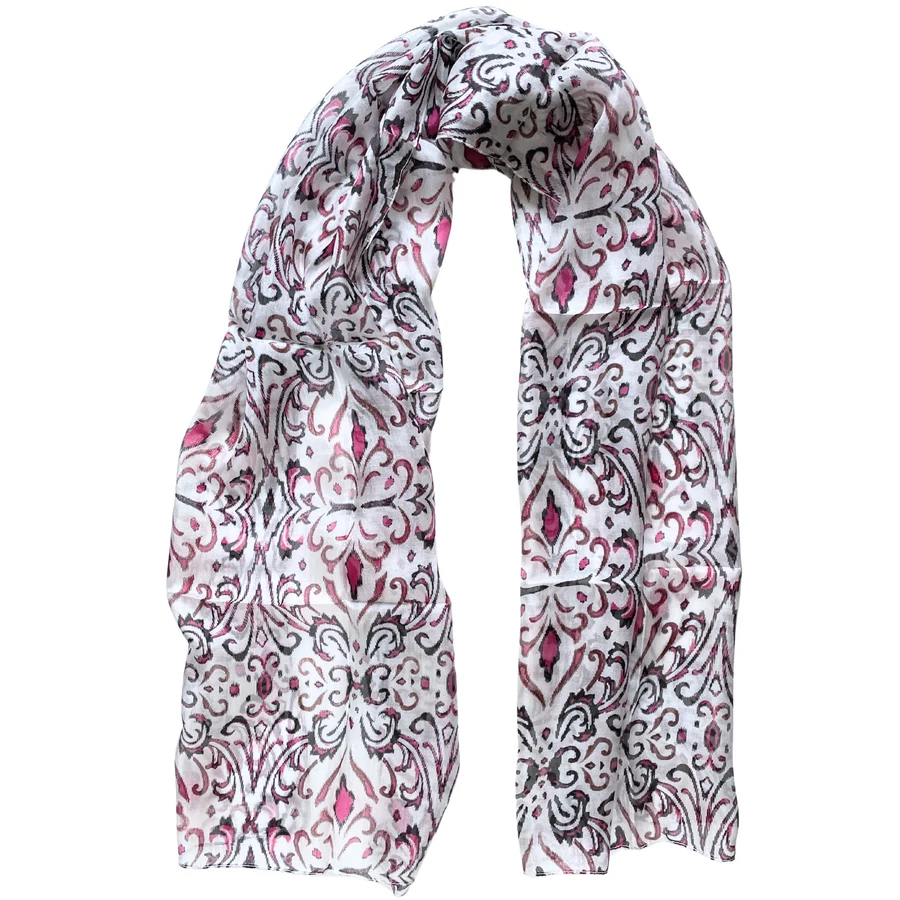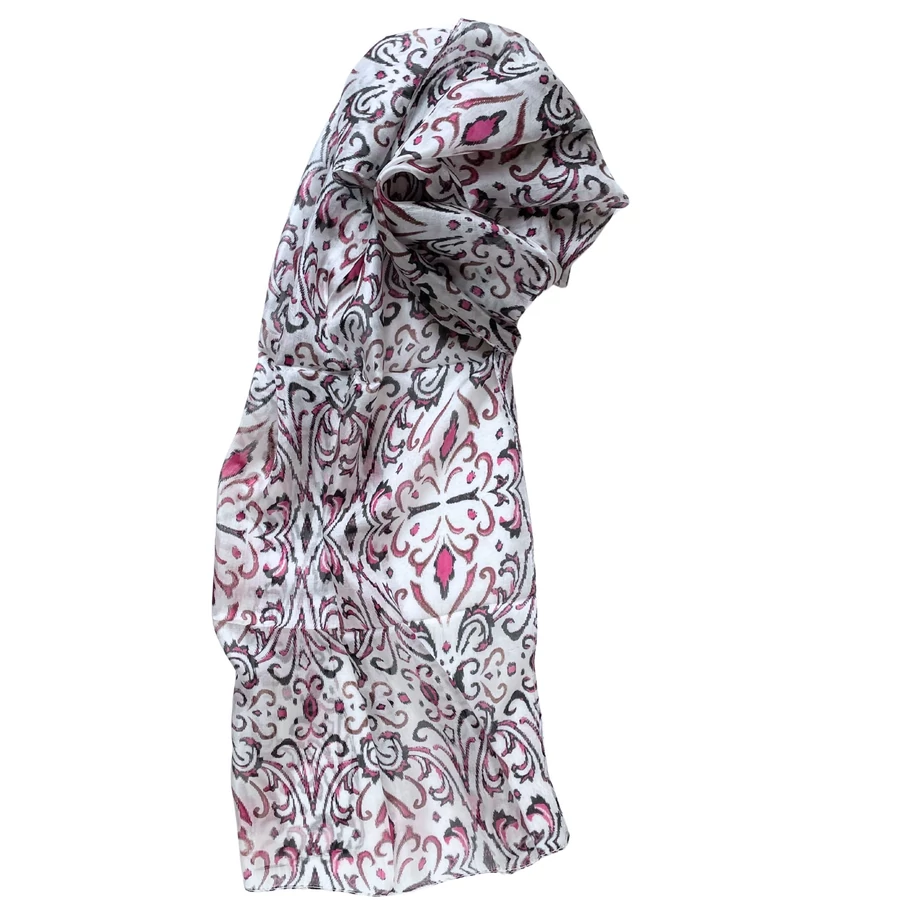 Habfehér alapon bársonyfekete és görögbíbor mintás 100% valódi hernyóselyem sál 50x180 cm