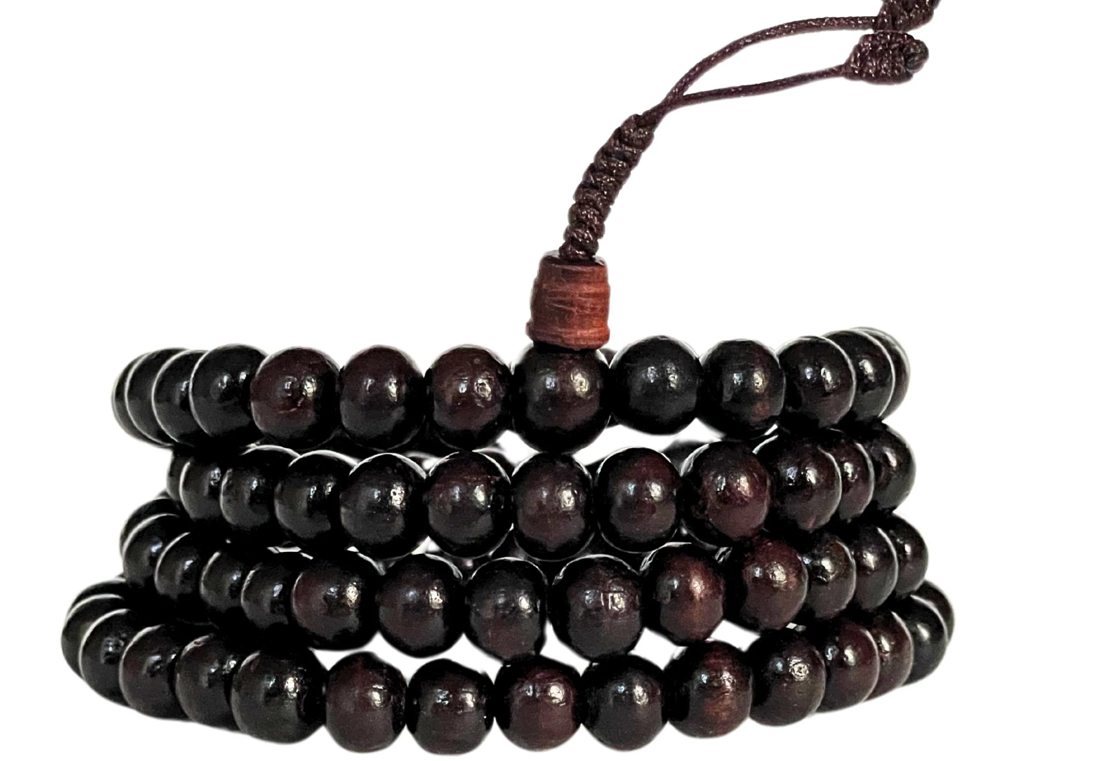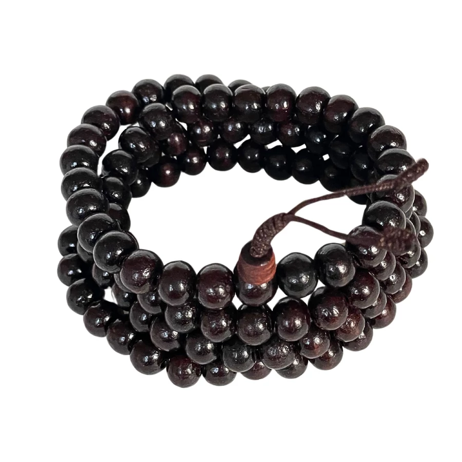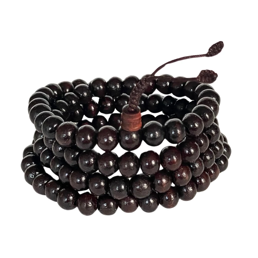 108 szem sorakozik rajta, mindegyik valódi rózsafából készült, selymesen sima, mélybarna felületük nyugalmat áraszt. A szabályos szemeket erős, barna színű malazsinór tartja össze, amit tibeti hagyomány szerint csomóztak – ez nemcsak stabilitást, hanem esztétikai egységet is ad a füzérnek.