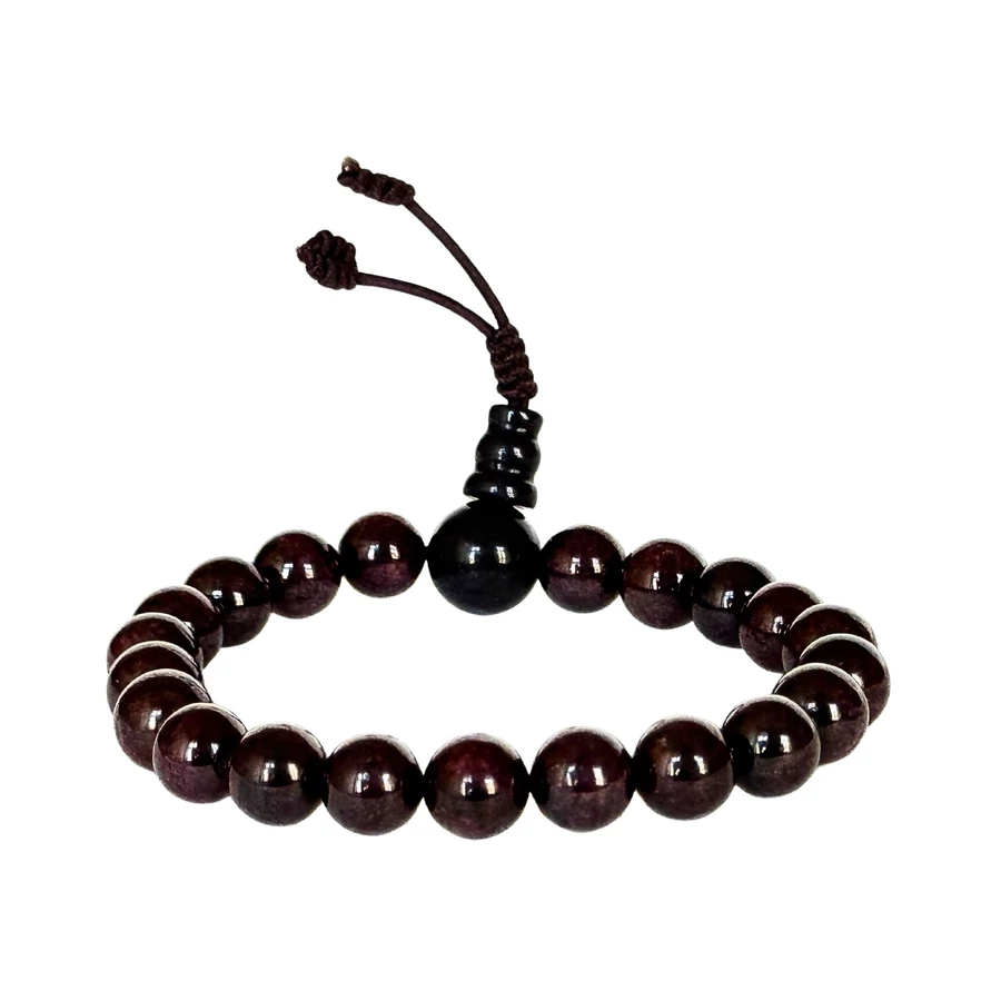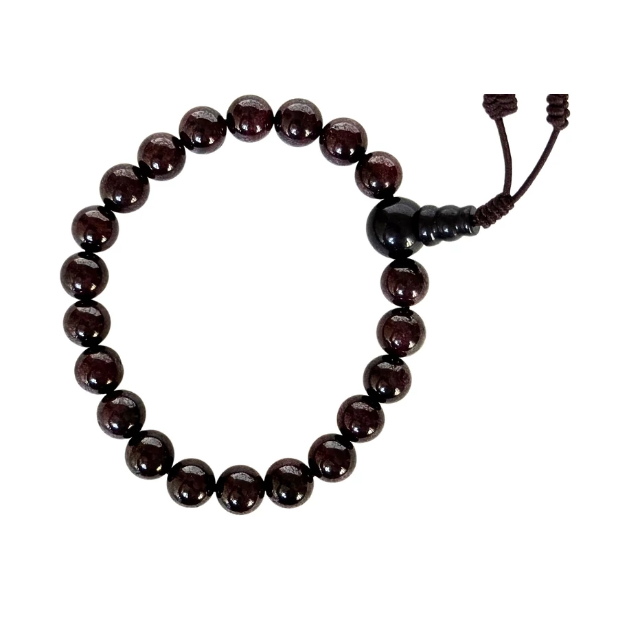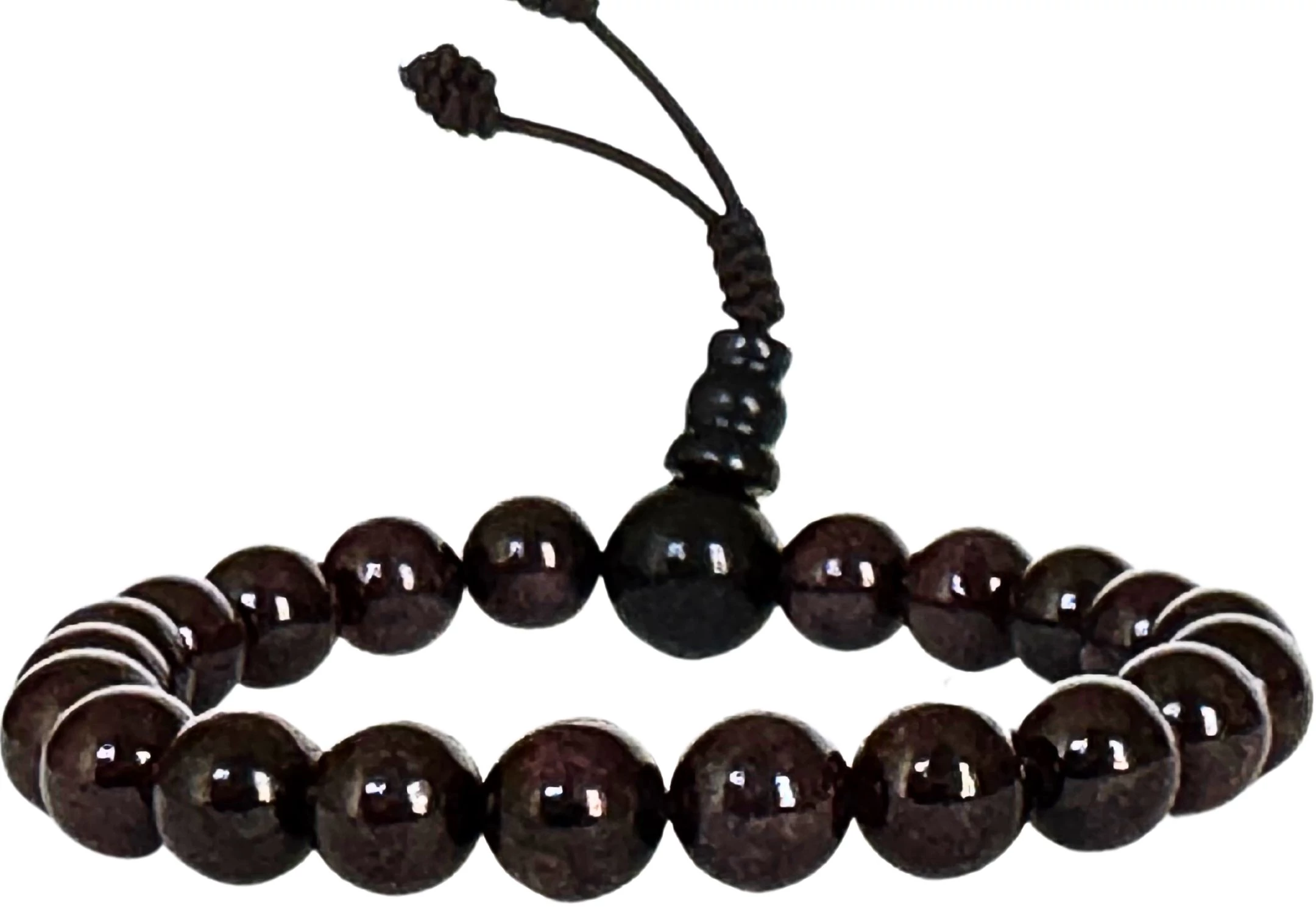 Gránát mala onix guruval – 21 szemes, 16 cm-es tibeti csomózású füzér. Mélyvörös, erőt adó ékszer, fókuszhoz és belső stabilitáshoz.