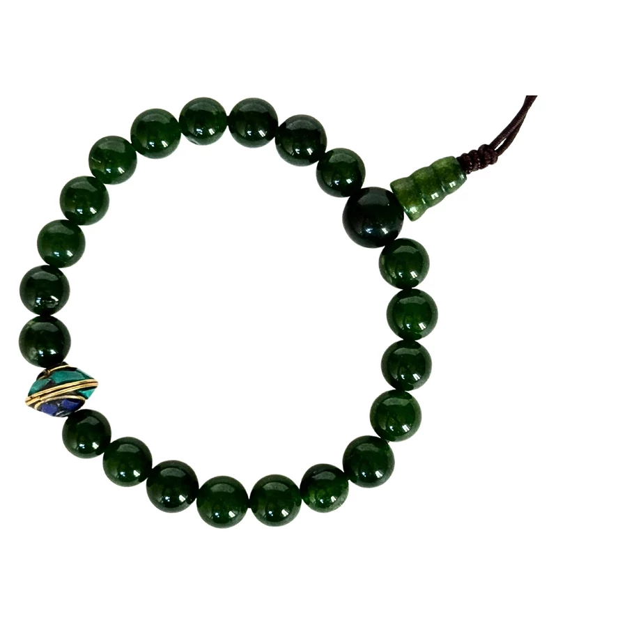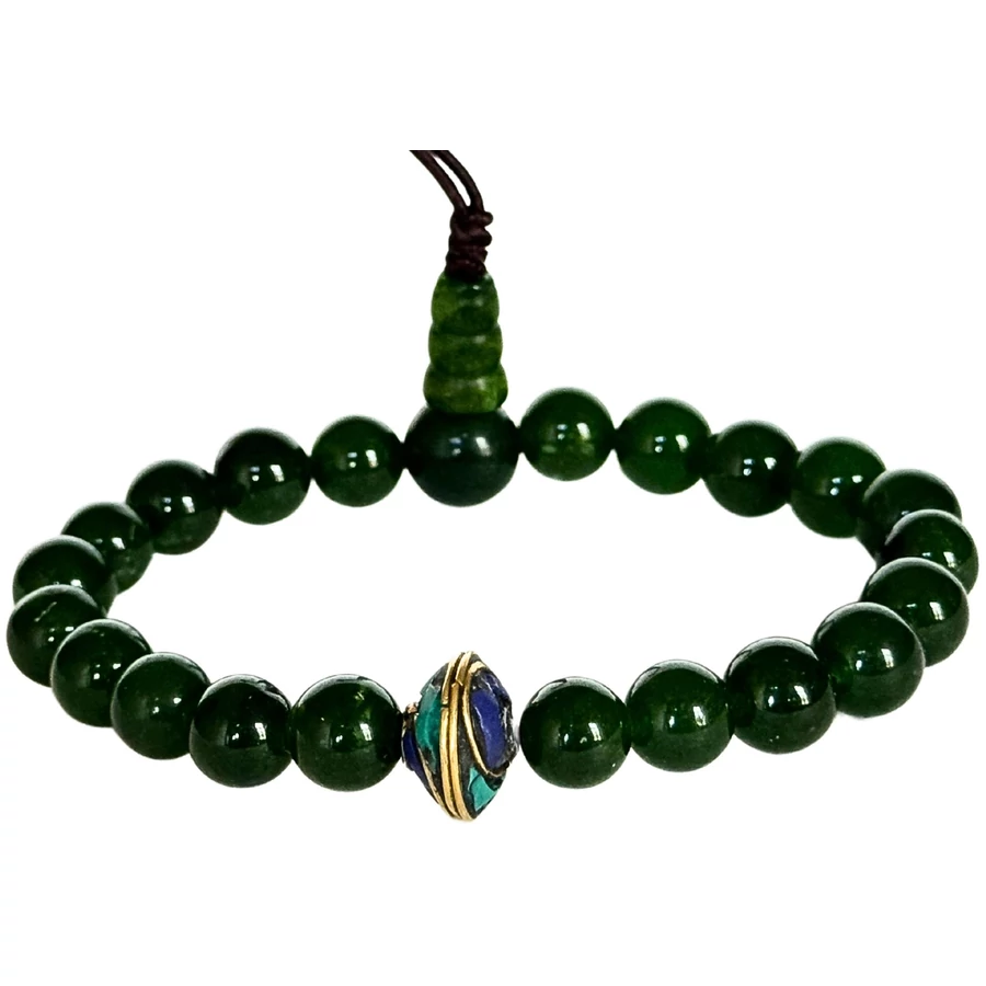 Mélyzöld, fényes jade szemek simulnak egymás mellé ebben a 16 cm-es, kézzel fűzött malában – egy cseppnyi harmónia, amit bármikor magaddal vihetsz. A jade hűvös tapintása az első érintésre nyugtató, mintha egy zöld tónál állnál meg pár pillanatra.