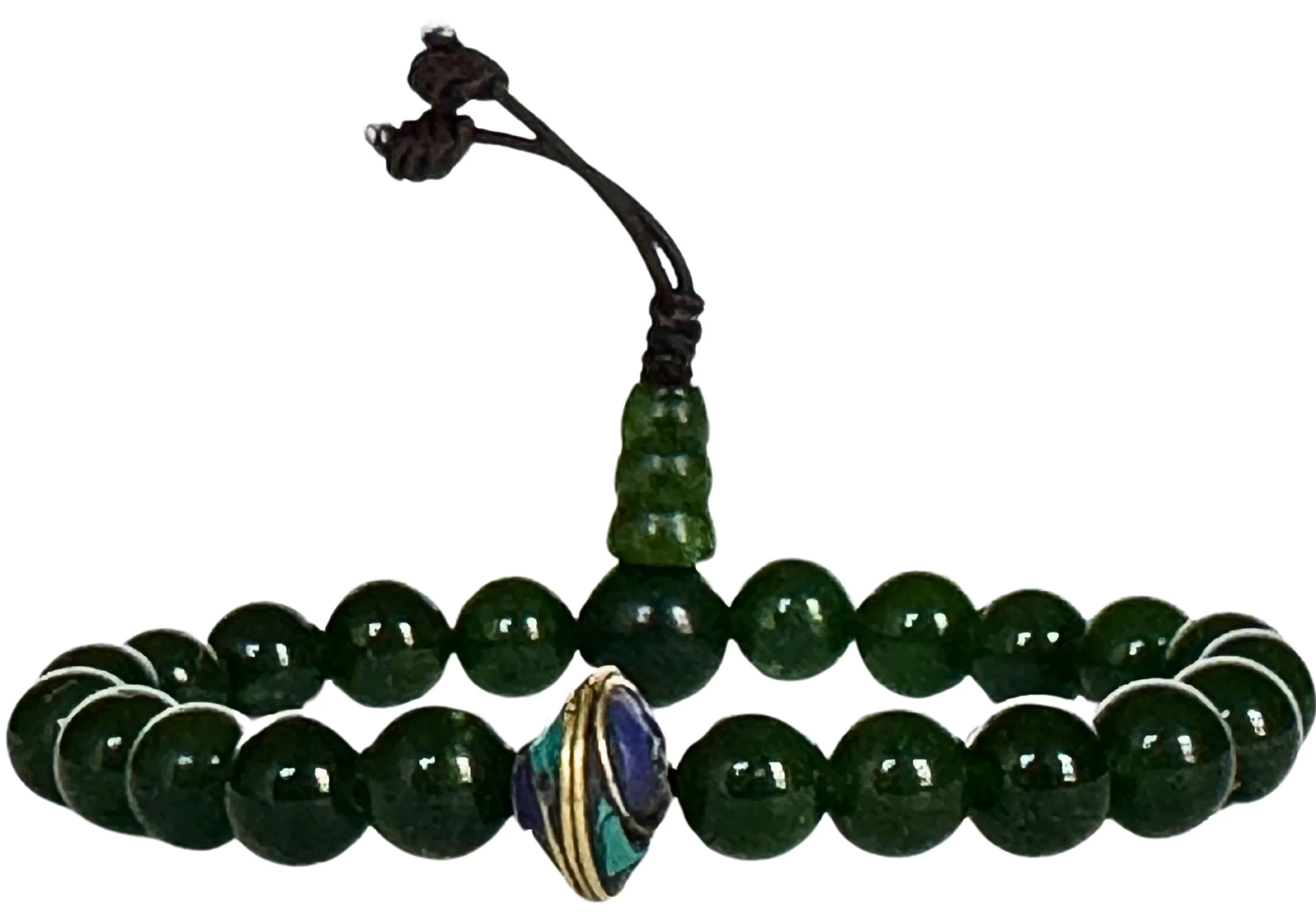 A tibeti kézműves osztógyöngy színes, rétegezett mozaikja azonnal magára vonja a tekintetet. Egy kis szertartásos szépség, mindennapi mantrázáshoz.