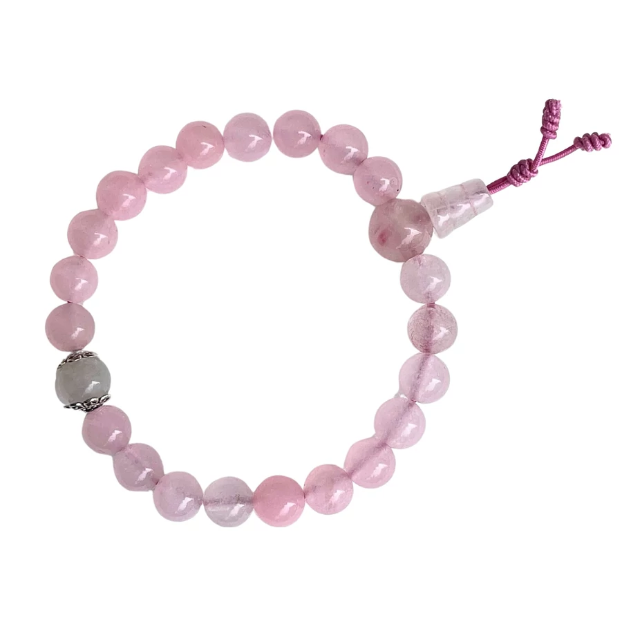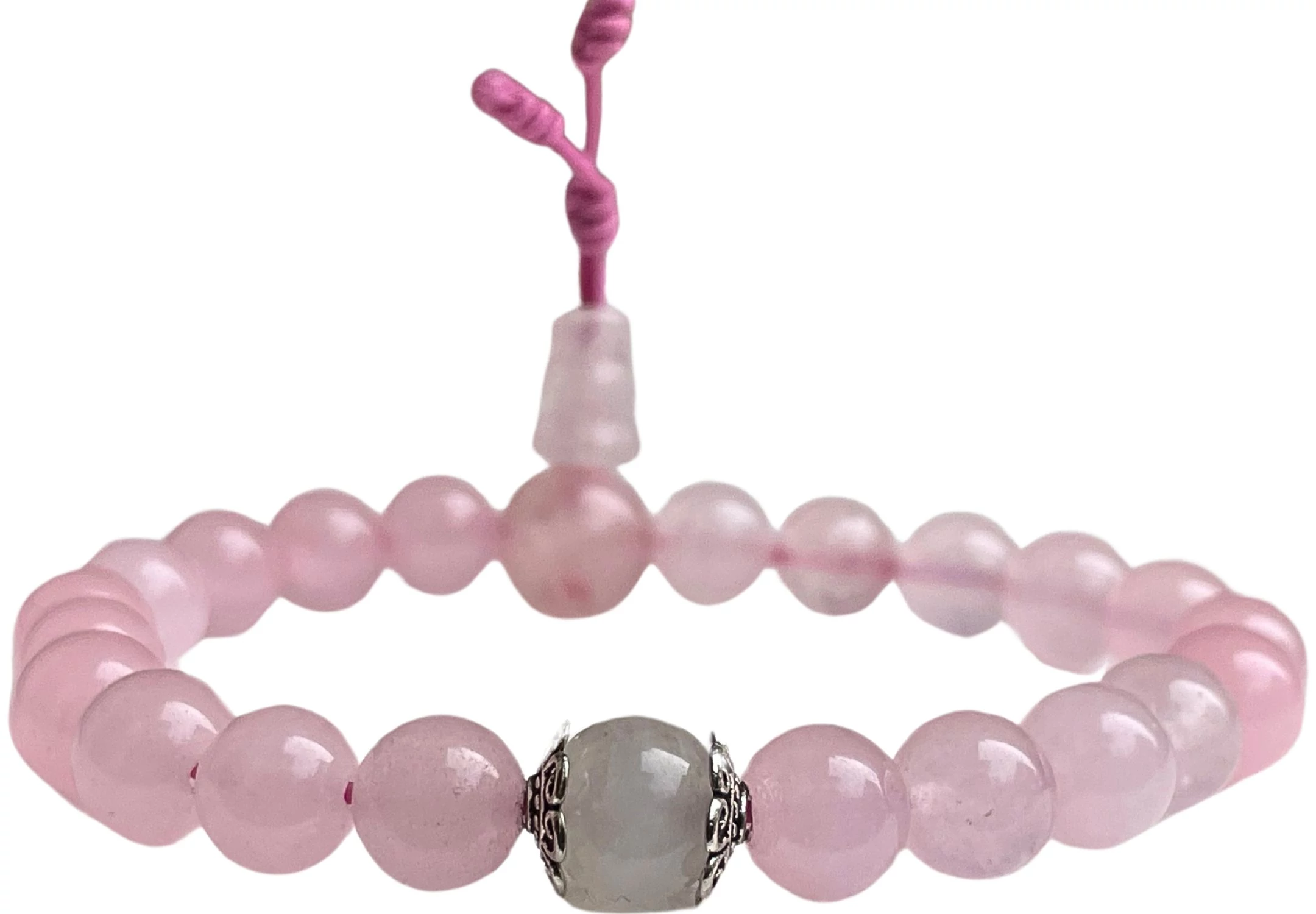 Lágy rózsaszín szemek finoman simulnak egymás mellé – ez a mala már ránézésre is melegséget áraszt. A rózsakvarc színe halvány, de nem fakó. Olyan, mint egy szelíd hajnal, vagy egy halk ölelés, amit napközben is magaddal vihetsz.