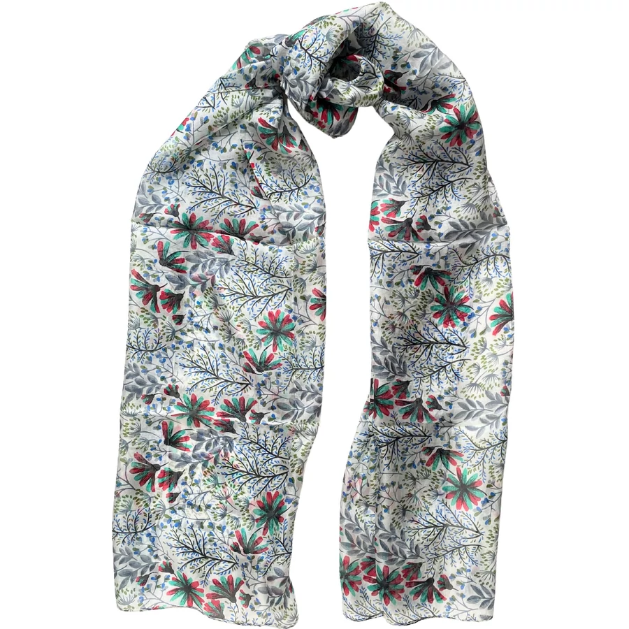 Jázminfehér alapon virágmintás 100% valódi hernyóselyem sál 50x180 cm