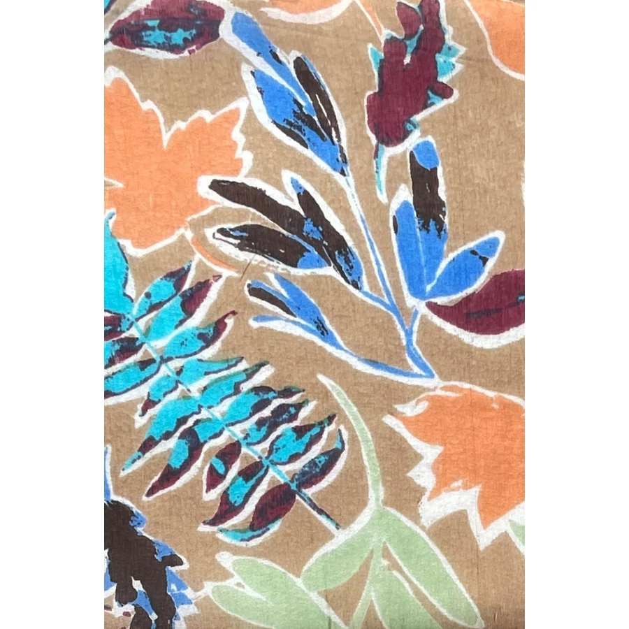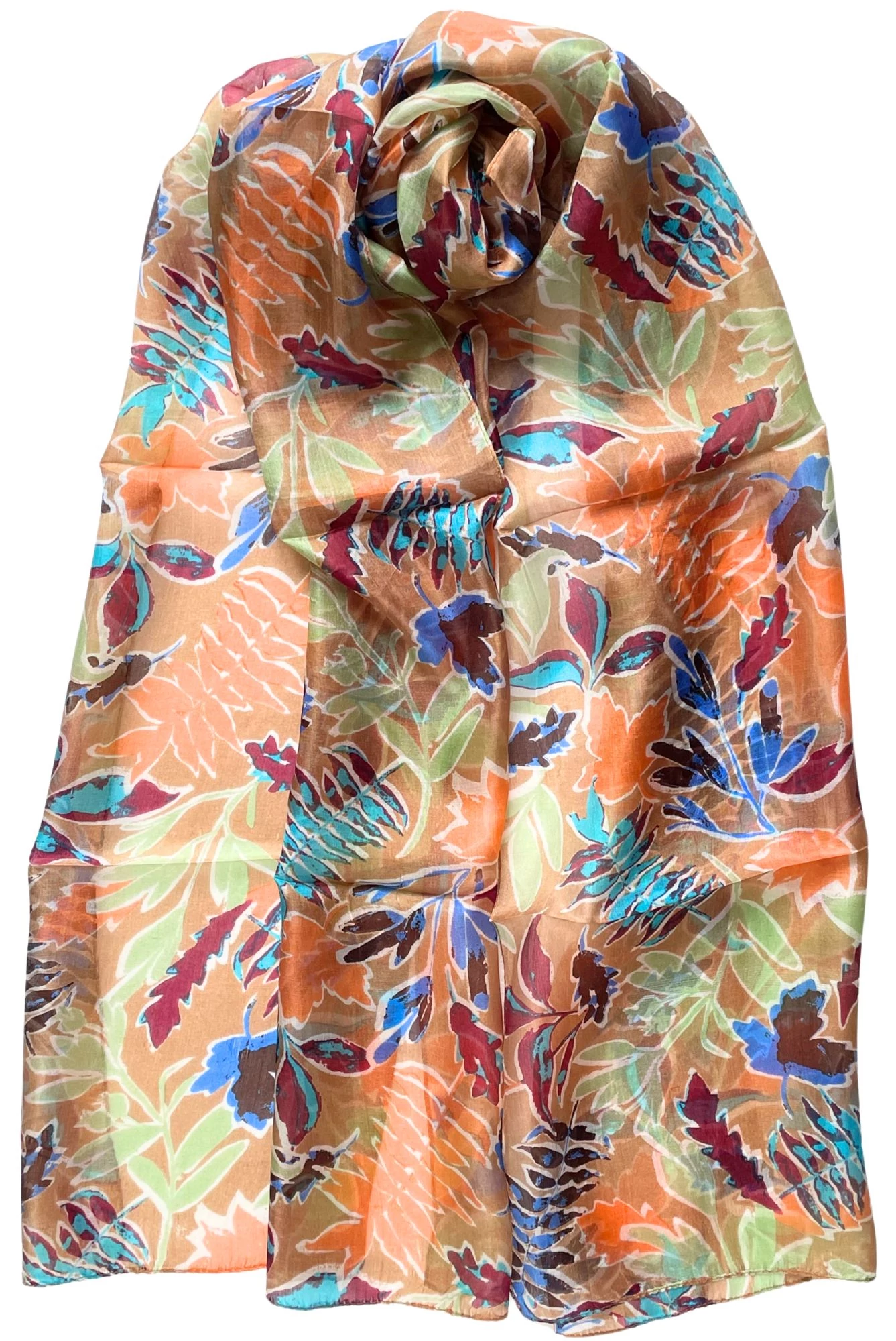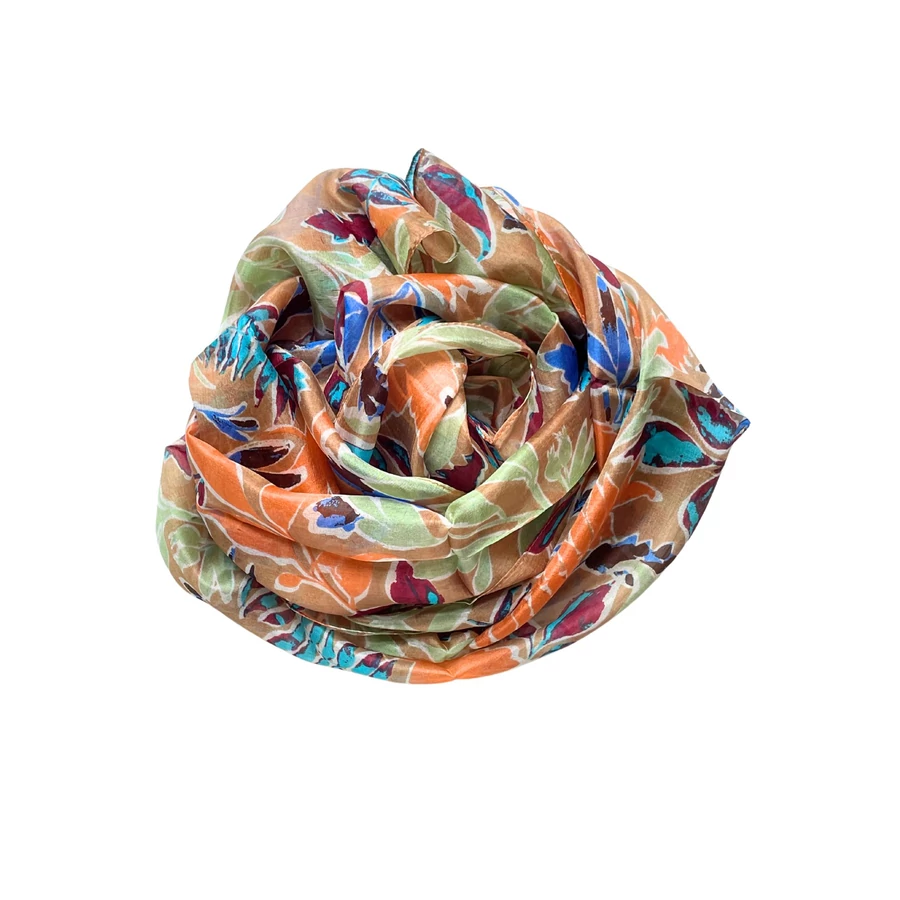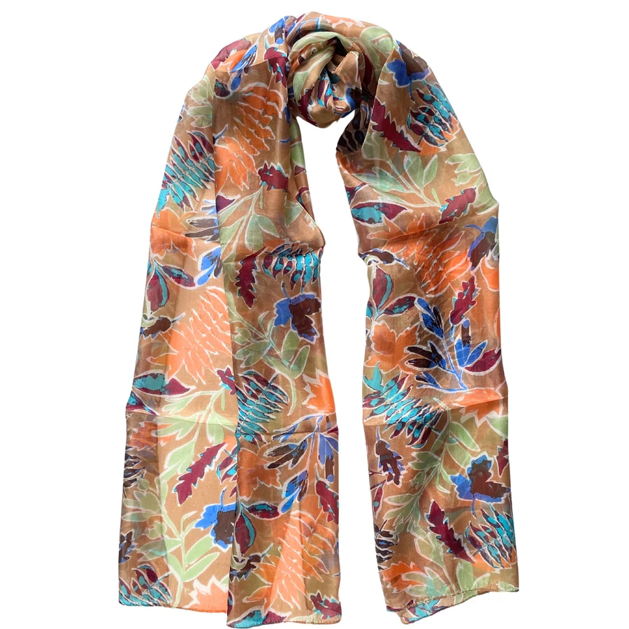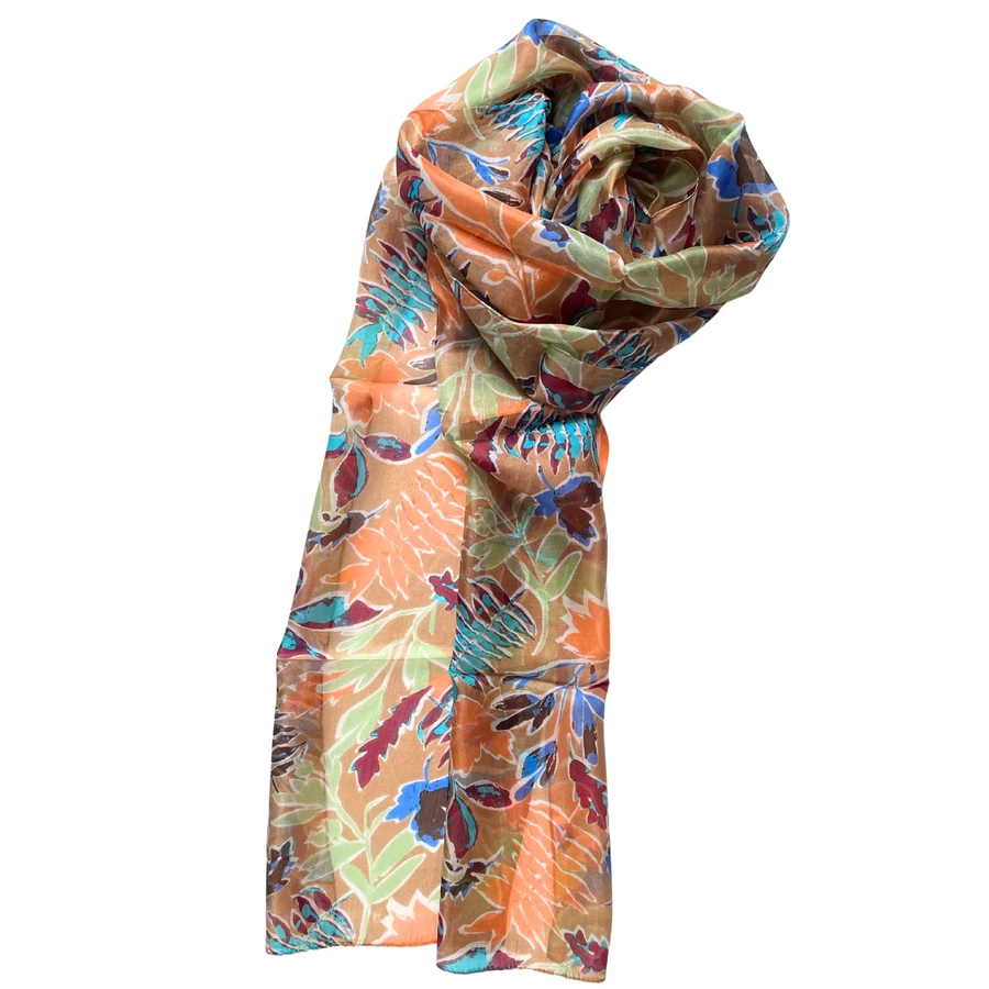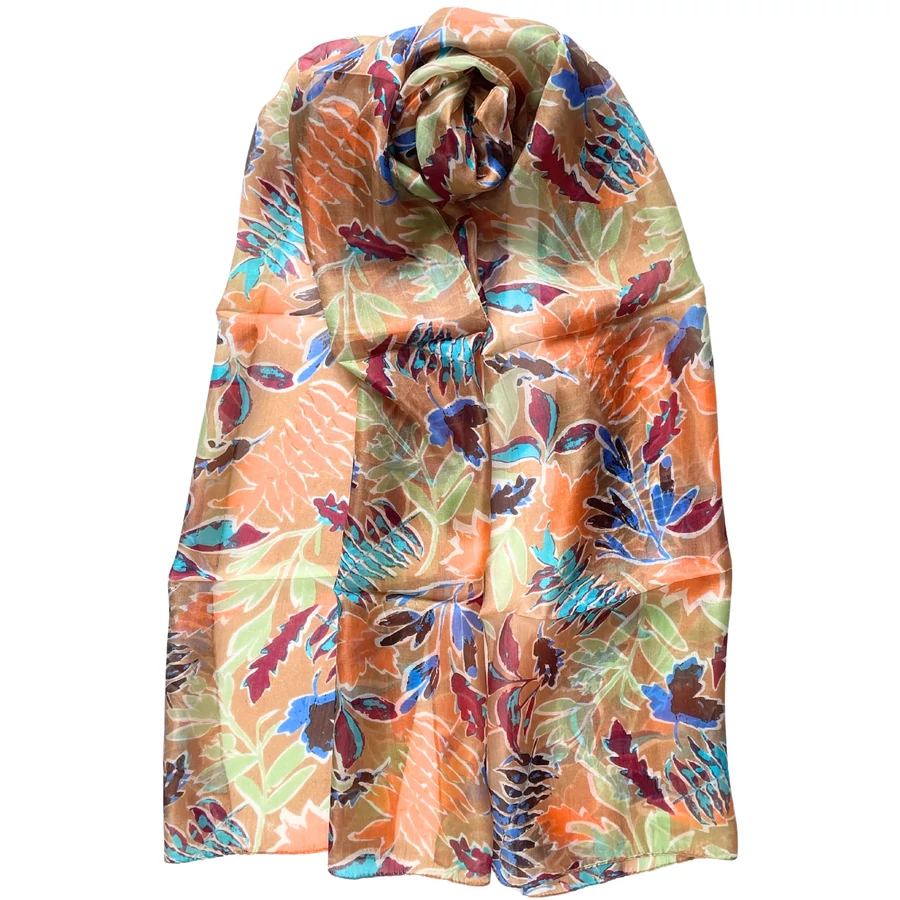 Mandulaszín alapon levélmintás 100% valódi hernyóselyem sál 50x180 cm